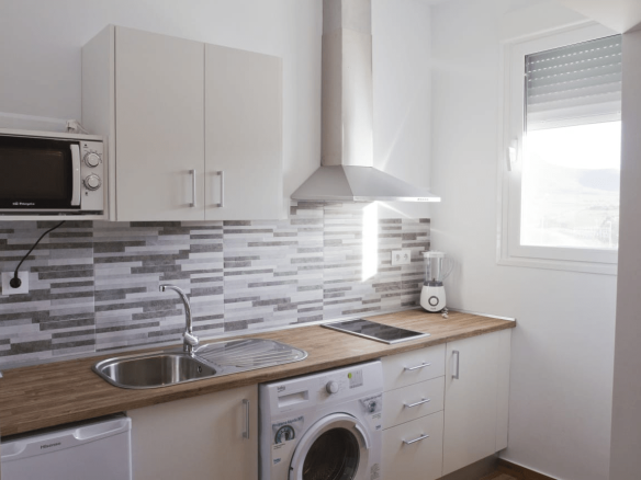 Two have a kitchen, washing machine, and a double bed